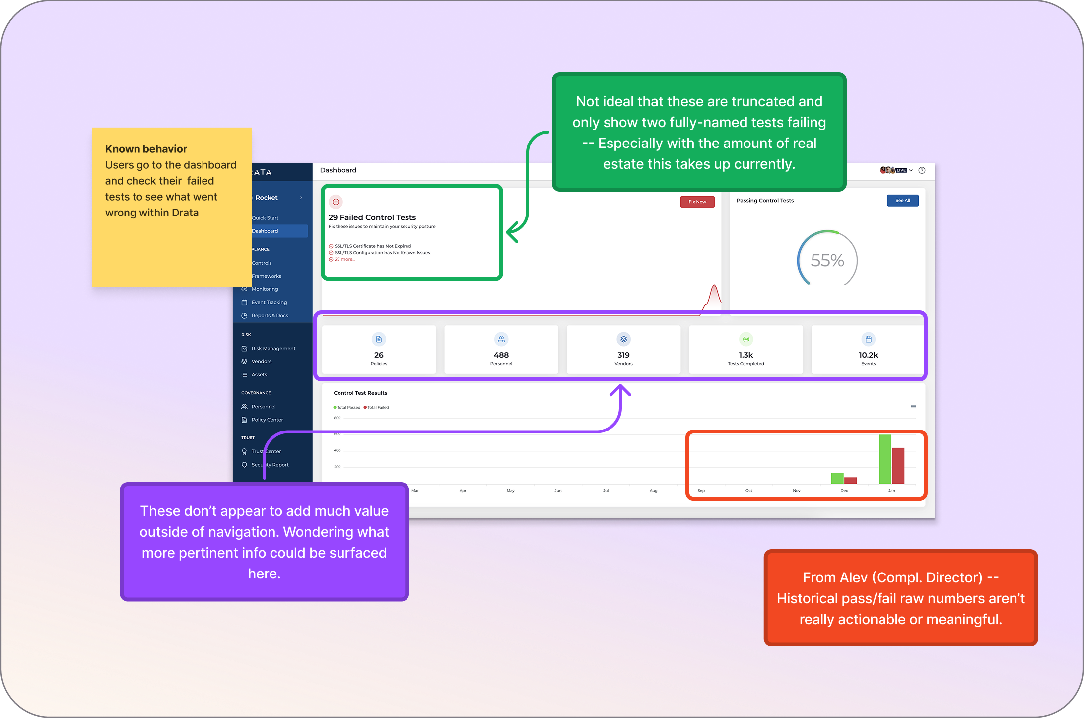 I audited Drata’s current dashboard to evaluate how well it met the core user need: “show me what I need to fix.”