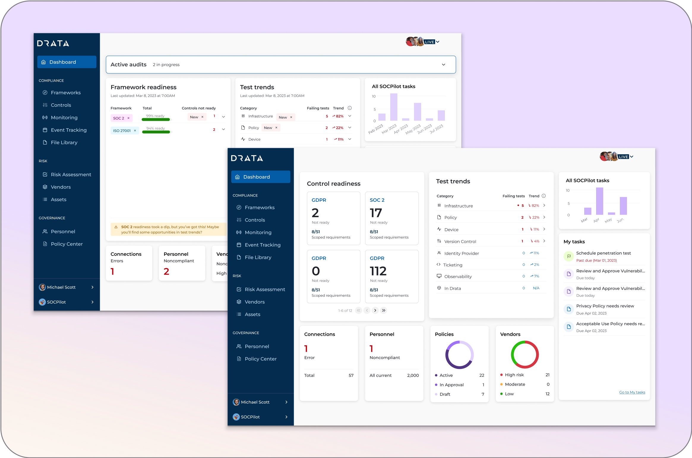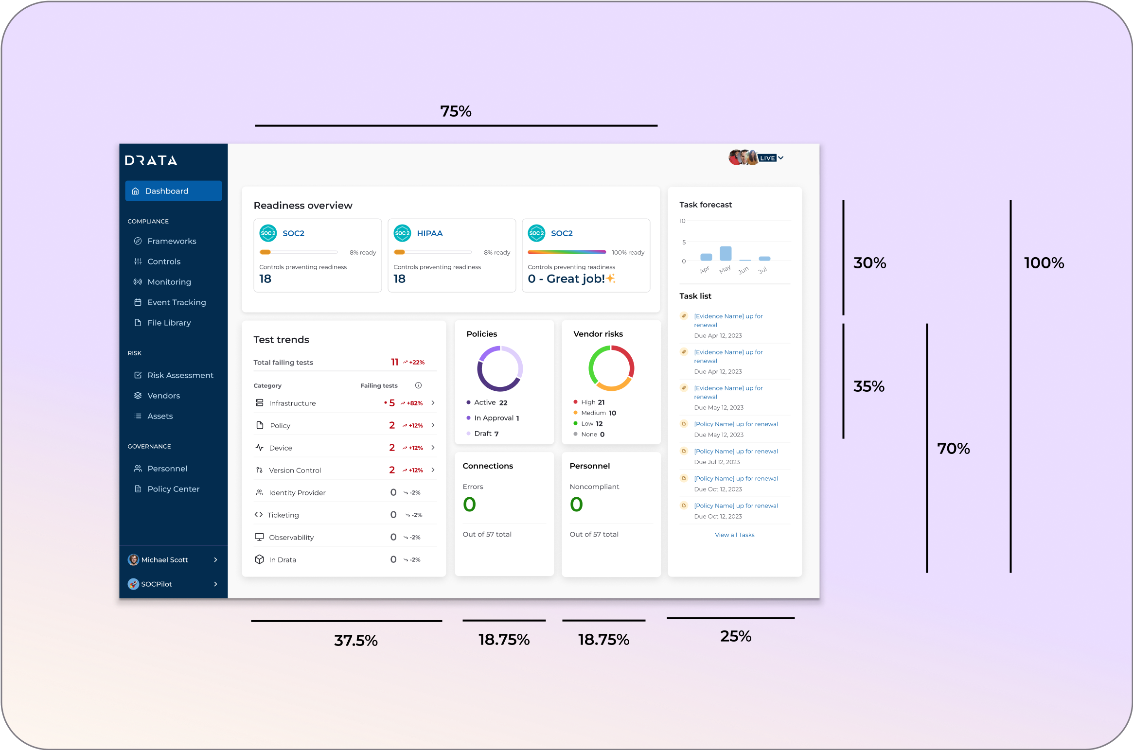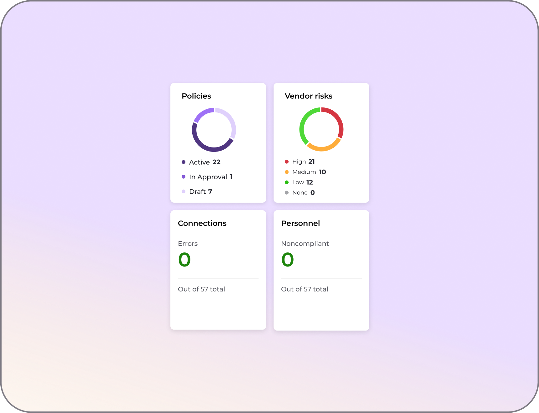 Quick-glance metrics for essential compliance categories—like policy status, vendor risk, personnel compliance, and system connections. Each widget links directly to the relevant section, enabling users to resolve issues with minimal friction.
