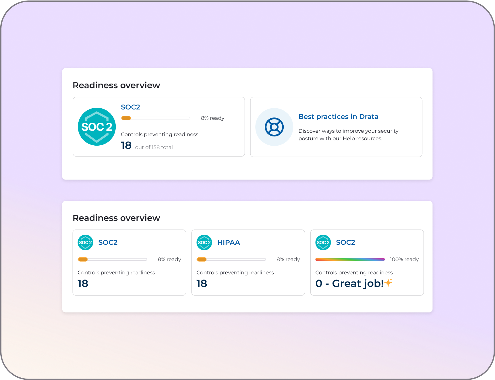 A dedicated section showing real-time progress across compliance frameworks (e.g., SOC 2, HIPAA, ISO 27001). Users can drill down directly into problem areas, with reduced clicks, making it faster to identify and resolve issues that impact audit readiness.