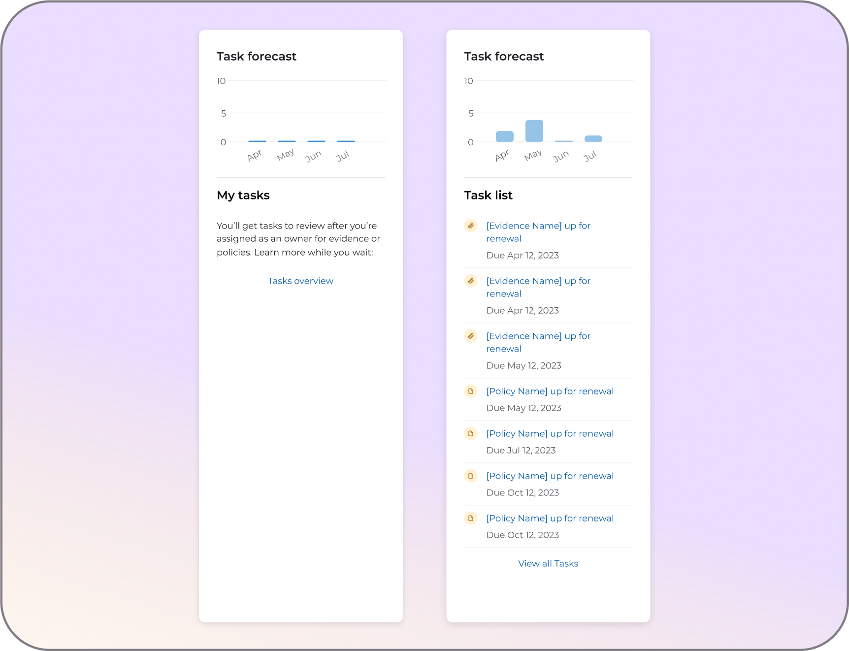 Surfaces upcoming tasks directly on the dashboard, helping Compliance Managers anticipate what’s next without having to dig. This forward-looking view reduces navigation friction and supports proactive compliance operations.